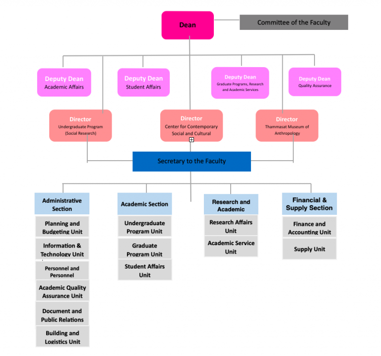As at the 2016 Academic Year, the administrative structure of the Faculty of Sociology and Anthropology, as approved by the meeting between the Faculty’s professors and committee, consists of the Dean, Deputy Deans and Directors for specific Affairs as follows: