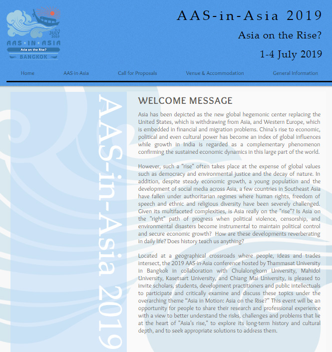 Thammasat University, in collaboration with Chulalongkorn University, Mahidol University, Kasetsart University and Chiang Mai University, will host the international academic conference, AAS-in-Asia, entitled “Asia on the Rise?” This event will be held from 1-3 July 2019 at Royal Orchid Sheraton. Those who are interested can send in abstracts from now until 22 October 2018.